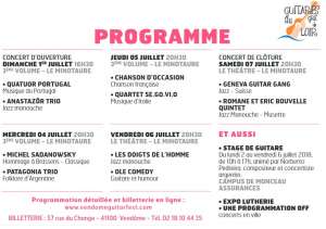 Ce 21ème Festival dédié à la Guitare et ses guitaristes, débute le 1er Juillet au 3ème Volume du Minotaure par un Quatuor du Portugal, ainsi qu’un Trio de Jazz Manouche, Anastazor Trio, et egrenne ses concert du mercredi au samedi 7 Juillet .
