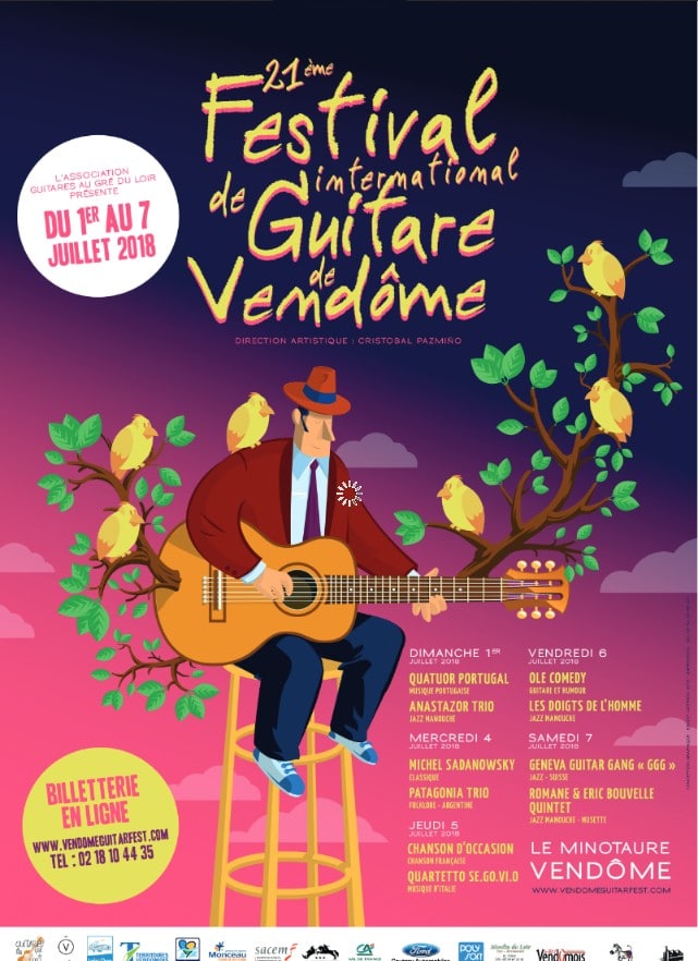 read more20ème édition du FESTIVAL INTERNATIONAL DE GUITARE DE VENDÔME GUITARES AU GRE DU LOIR Association, fête cette année le 20ème festival de Guitare à Vendôme . Dimanche 2 juillet 2017 : Concert d’ouverture à l’Artésienne à Villiers-sur-Loir – à 18h30 Jour de fête – Cabaret/humour/chanson française Mardi 4 juillet 2017 : Concert au Minotaure à […]