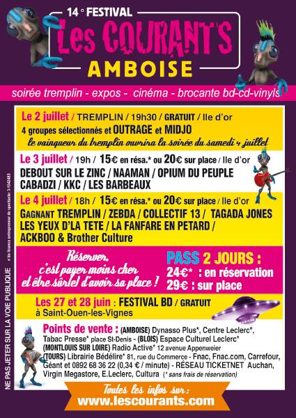 read moreLe Festival Les Courants à Amboise du jeudi 30 juin au samedi 2 Juillet, a ouvert ses portes par une série de concerts tremplins, destiné à des groupes locaux: Bunjil’ : duo de chansons française avec guitare et percussion Daoud et Kristobal : groupe de rock français pechu Jeans : groupe de rock anglais classique […]